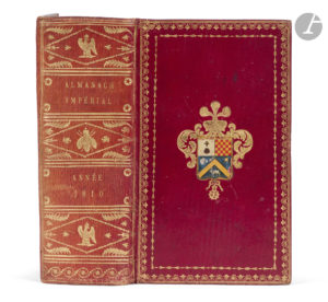 orné d’aigles couronnées et d’une abeille, roulette dorée intérieure, doublures et gardes de soie verte, tranches dorées (reliure de l’époque). Almanach officiel de l’Empire de 1810. Exemplaire sur papier vélin fort, provenant de la bibliothèque d’Antoine-Jean-Mathieu Séguier (1768-1848), avec ses armes peintes sur les plats, maître des requêtes, premier président de la cour d’appel de Paris, nommé baron d’Empire en 1808 et pair de France en 1815. Dos passé, quelques frottements d’usage. Petits manques aux armes sur le premier plat. Trou de ver à une charnière. Provenance : Antoine-Jean-Mathieu Séguier, avec ses armes peintes sur les plats.