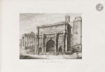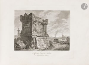 premier plat, dos lisse orné, tranches rouges (reliure de l’époque). Ce très bel album rassemble 40 planches représentant des vues des ruines de Rome, réalisées par le dessinateur et graveur italien Domenico Amici (1808–18.). L’exemplaire présenté ici comprend l’intégralité des vues exécutées par l’artiste entre 1832 et 1837, chaque planche portant la date de sa création. Des éditions ultérieures reprendront ces mêmes planches, enrichies de nouvelles vues datées des années 1840. Ces gravures, très recherchées aujourd’hui, se distinguent par leur format et leur précision remarquable. Chacune d’elles intègre des scènes animées par des personnages, ce qui confère aux vues un réalisme saisissant, presque photographique. Exemplaire sur papier vélin, provenant de la bibliothèque du colonel britannique Henry Madox, avec son ex-libris sur lequel il est également écrit « Rome 1839 ». Madox a commencé sa carrière militaire en 1800 comme cornet (grade le plus bas dans la cavalerie britannique) et est devenu capitaine en 1805. Pendant la campagne de Waterloo, après la bataille de Quatre-Bras, il a dirigé trois escadrons de cavalerie pour évacuer les blessés vers Bruxelles. Le 18 juin 1815, il a commandé un escadron des Inniskillings lors de la charge, puis a pris la tête du régiment après la perte des officiers supérieurs. Promu major par brevet pour ses actions, il a ensuite été confirmé major en 1817, mis en demi-solde en 1825, puis rétabli en 1833. Il a finalement été promu lieutenant-colonel la même année et colonel en 1838. L’ouvrage fut par la suite acquis par Sidney Carr Hobart Mercer Henderson, 7e comte de Buckinghamshire (1860-1930), homme politique libéral britannique, avec son ex-libris. Frottements et épidermures à la reliure, accroc à la coiffe de tête. Rares rousseurs. Provenance : Henry Madox, avec ex-libris. - Sidney Carr Hobart Mercer Henderson, 7e comte de Buckinghamshire, avec ex-libris.