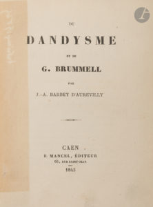 BARBEY D’AUREVILLY (Jules). Du Dandysme et de G. Brummel. Caen : B. Mancel, 1845. — In-16, 144 x 112 : vij, 118 pp., (2 ff. dernier blanc). Demi-chagrin fauve, dos à faux nerfs orné, tranches mouchetées (reliure vers 1900). Édition originale...