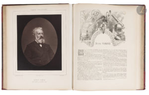 originale de l’une des plus grandes publications illustrées par la photographie de la fin du XIXe siècle, publiée en livraisons de 1876 à 1884 sous l’impulsion de l’éditeur Ludovic Baschet. Qualifiée de « véritable encyclopédie de tous les grands Hommes qui, à un titre quelconque, ont illustré la France » (Paul Lacroix, Revue illustrée, mars 1904), cette œuvre monumentale se présente comme un panthéon visuel et biographique de l’époque. Jusqu’au tome 9, chaque année est divisée en deux semestres, contenant chacun deux séries : Première série : Consacrée aux littérateurs, musiciens, hommes politiques, artistes, etc., illustrée de portraits photographiques hors texte. Deuxième série : Centrée sur les peintres et sculpteurs, avec des portraits photographiques dans le texte et des reproductions d’œuvres d’art hors texte. À partir du tome 10 (1881), la publication prend le titre Galerie contemporaine artistique : Peintres & sculpteurs : Nouvelle série. L’ensemble réunit les biographies de 242 personnalités marquantes des mondes politique, artistique et littéraire, parmi lesquelles figurent Victor Hugo, Jules Claretie, François Coppée, Sarah Bernhardt, Gounod, Charles Baudelaire, George Sand, Victorien Sardou, Adolphe Thiers, Clémenceau, Gustave Eiffel, Gustave Doré, et bien d’autres. Ces biographies sont ici accompagnées de 451 photographies (sur 464), dont 241 portraits et 210 reproductions d’œuvres (sur 223). La plupart de ces images sont collées sur papier cartonné et montées sur onglet. Elles ont été reproduites par photoglyptie d’après les clichés des plus grands photographes de l’époque, tels que Nadar, Carjat, Goupil, Mulnier, etc. Seule Élie Delaunay n’a pas de portrait. On y trouve également des fac-similés d’écriture et des reproductions d’œuvres dans le texte ou à pleine page. L’exemplaire présenté ici comprend tous les portraits photographiques, mais il manque 13 photographies d’œuvres : Sylvestre et Delacroix (tome 2), Carpeaux et Detaille (tome 3), Ingres (tome 6), Lefebvre (tome 8), Ranvier et deux de Diogène Maillart (tome 10), ainsi que deux de Barrias et deux d’Alfred Lanson (tome 13). Il manque également la seconde livraison sur Ingres (tome 6), le feuillet de la première livraison consacrée à Diogène Maillart (tome 10), et la deuxième livraison sur Bellel (tome 12). Frottements et épidermures aux reliures, un coin cassé (tome 11). Quelques rousseurs éparses. Deux premières gardes du 9e volume (cinquième année) déreliées, ainsi qu’un feuillet et deux planches dans le tome 12 et deux feuillets dans le tome 13.