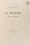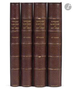 65 planches, 2 fac-similés, couverture imprimée ; frontispice, (2 ff.), 230 pp., (1 f.), 82 planches, 1 fac-similé, couverture imprimée ; (2 ff.), 253 pp., (1 f.), 103 planches, 2 fac-similés, couverture imprimée. Maroquin bordeaux janséniste, dos à nerfs, multiples filets dorés à l’intérieur, tête dorée, non rogné, couverture conservée, étui bordé (Chambolle-Duru). Édition tirée à 295 exemplaires numérotés sur papier vélin du Marais, de l’un des ouvrages de références sur la reliure au XIXe siècle. Elle est illustrée de 10 fac-similés d’autographes, dont 4 en frontispice, de 4 fac-similés de l’album du relieur-doreur, de 6 tracés de dorures, de 283 planches de reliures et de 2 planches de portraits. Très bel exemplaire en pleine reliure de Chambolle-Duru. Dos très légèrement passés, petits frottements à quelques nerfs. Traces brunes sur quelques feuillets dans le premier volume. Provenance : Bourlon de Rouvre, avec ex-libris.