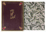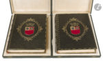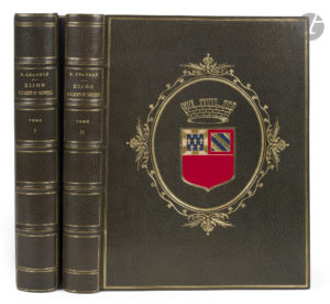 plats, armes de la ville de Dijon dorées et mosaïquées dans un encadrement ovale doré bordé de fleurs au centre du premier plat, dos à nerfs orné, roulette dorée en encadrement à l’intérieur, doublures de maroquin bordeaux à long grain orné d’un encadrement de deux filets dorés avec des armes de Dijon et de Bourgogne dorées et mosaïquées aux angles, chiffre EL doré et mosaïquée au centre de la première doublure, et rosace faite de feuillages dorés entourant une pastille de maroquin rouge orné d’une feuilles de vigne et d’une grappe de raisin dorés au centre de la deuxième doublure, gardes de soie moirée comprenant un décor marbré dans les tons violets, hommages en lettres dorées sur la première garde du premier volume, tête dorée, non rogné, coffret en simili cuir vert, doublé de velours et de soie beige, décor d’une cordelette blanche en encadrement, fermoirs (Marchet et Roux). Édition originale de ce monumental ouvrage de l’avocat et historien d’art Henri Chabeuf (1835-1925), qui fut couronné par l’Académie française (prix Thérouanne). « Le titre donné à ce livre indique assez que l’on n’a pas eu pour objet de faire une histoire méthodique et complète, mais de tracer le tableau matériel et moral de Dijon à travers les âges, en attachant à chaque pierre le souvenir des hommes qui se sont succédé là où nous vivons, et ont laissé quelque chose d’eux-mêmes dans les monuments que le temps et les générations ont respectés ou détruits » (Avant-propos). L’illustration comprend 140 photogravures dont 100 hors texte. Précieux exemplaire, un des 10 sur papier de Hollande (n° 10) numérotés et signés par l’éditeur à la justification. Il s’agit de l’exemplaire offert par la municipalité de Dijon au nouveau président de la République française, Émile Loubet (1838–1929), à l’occasion des grandes fêtes des 21 et 22 mai 1899, peu après son élection à cette fonction le 18 février 1899. Somptueusement relié par les relieurs dijonnais Marchet et Roux, cet exemplaire porte, sur la première garde du premier volume, cet hommage en lettres dorées : À Monsieur Émile Loubet, Président de la République française. Hommage de la Municipalité de Dijon en souvenir des 21 et 22 mai 1899 Les faux titres comportent également cette dédicace autographe signée du maire de la ville de Dijon de l’époque, Auguste MORIN-GACON : Témoignage de reconnaissance // à Monsieur Emile Loubet // Président de la République // Offert par la Municipalité // au nom de la ville de Dijon // Dijon 21 mai 1899 // Le maire // Aug. Morin-Gacon Cette dédicace est accompagnée du cachet de la mairie de Dijon. Joint un exemplaire du menu du banquet offert par la ville à Émile Loubet à la salle des États de Bourgogne le 21 mai 1899. Quelques rousseurs sinon exemplaire parfaitement conservé. Fermoirs des coffrets défectueux.
