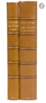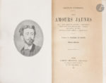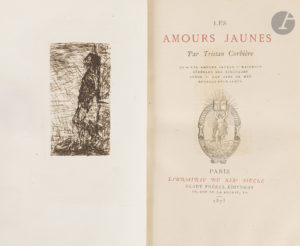 couverture conservée (reliure du début du XXe siècle). En français dans le texte, 298. Édition originale recherchée de l’unique recueil poétique de Tristan Corbière (1845-1875), publié à compte d’auteur et comprenant presque l’intégralité de son œuvre. Découvert par Verlaine, Corbière a vécu une existence brève en Bretagne, marqué par la tuberculose, célibataire, sans enfant et sans emploi. Il fait partie de ce que l’on appelle les « poètes maudits ». Son livre est dédié à son père, Édouard Corbière, célèbre auteur de romans maritimes. L’édition fut tirée à 490 exemplaires ; elle est illustrée d’un autoportrait en frontispice, gravé à l’eau-forte. Un des 481 exemplaires sur Hollande, bien relié. Dos légèrement plus sombre. On joint, du même auteur : - Les Amours jaunes. Préface de Charles Le Goffic. Paris : Albert Messein, 1912. — In-12, demi-maroquin citron à coins, dos à nerfs, tête dorée, non rogné, couverture et dos conservés (G. Huser). Nouvelle édition, illustrée d’un portrait photographique de l’auteur en frontispice et de la reproduction hors texte de l’eau-forte de l’édition originale. Un des 10 exemplaires sur papier de Hollande, seul tirage sur grand papier. Bel exemplaire relié par Huser. Titre et bord de la page V brunis. Provenance : Ex-libris RH.