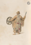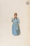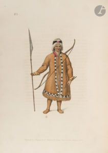 (reliure moderne avec plats et dos d’origine rapportés). Édition originale franco-anglaise faisant partie de la collection sur les costumes publiée par Miller. Dédiée à Charles Hatchett, elle comprend 73 planches gravées en couleurs au pointillé par J. Dadley, faisant connaître les nombreuses nations de l’Empire de Russie au début du XIXe siècle.. « L’authenticité de cet ouvrage peut d’autant moins être révoquée en doute que les planches qu’il contient ont été fidèlement copiées d’après celles de la collection commencée à Pétersbourg en 1776, et finie en 1779, par les soins et aux frais de C. W. Müller, conformément aux désirs de l’Impératrice Catherine II qui en accepta la dédicace. Dans l’ouvrage […] nous avons exactement suivi le plan de l’original. Ainsi, les vingt premières Planches offrent la description des nations qui tirent leur origine des Finlandois. On trouvera celle des différentes hordes de Tartares soumises à la Russie, dans les vingt-deux Planches suivantes. La Planche Quarante-troisième, et les suivantes, jusqu’à la Cinquante-neuvième inclusivement, se rapportent aux différentes tribus de Samoyèdes, et à celles qui habitent la partie la plus orientale de la Sibérie, et les iles de l’Océan Oriental. La Planche Soixantième, et les suivantes, comprennent les Kalmoucks, les Mongoles, et quelques autres tribus moins considérables » (Préface). Exemplaire en reliure moderne, avec les plats, le dos et les gardes d’origine rapportés avec leurs défauts restaurés (épidermures, manques, etc.). Rousseurs éparses. Transfert des gravures sur les feuillets en regard. Provenance : ex-libris représentant un avant-bras tenant une torche, surmontée de la divise « Dux mihi Deus ».
