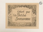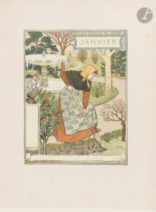 calendrier, conçu par l’affichiste, peintre et graveur d’origine suisse Eugène-Samuel Grasset (1845–1917) pour le célèbre magasin parisien de prêt-à-porter « La Belle Jardinière ». Ce chef-d’œuvre, emblématique du style Art Nouveau, se compose de douze planches en couleurs, gravées sur bois et imprimées en chromotypographie. Chacune représente une figure féminine allégorique, vêtue avec élégance selon la saison et associée au signe du zodiaque correspondant. Destiné à promouvoir les vêtements féminins, ce calendrier n’était pas vendu, mais offert gracieusement aux clients en caisse. Grasset, soucieux de la qualité artistique de cette publication, exposa les aquarelles originales au Salon de la Société nationale des beaux-arts, soulignant ainsi l’importance qu’il lui accordait. Exemplaire précieux, complet de la couverture imprimée et enrichi du rare placard indiquant « Offert par La Belle Jardinière », encadré d’un motif floral typiquement Art Nouveau. Ce placard, ainsi que les douze planches, ont été collés sur papier vélin et montés sur onglets. L’exemplaire est en outre augmenté de la suite avant la lettre de chaque planche, au format in-4 sur papier glacé, également montée sur onglets. Reliure signée Carayon, en excellent état, avec seulement quelques légères rousseurs sur la suite avant la lettre.