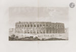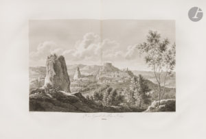 fonderie de Jules Didot l’aîné, 1836 (tome 2). — 2 volumes grand in-folio, 595 x 430 : frontispice, (2 ff.), iv, 94 pp., 116 planches ; (3 ff.), 52 pp., 142 planches. Demi-veau blond, dos lisse orné, non rogné (reliure moderne). Édition originale de cet ouvrage majeur dédié aux monuments anciens de France, publié par le comte Alexandre de Laborde (1773–1842), homme politique, écrivain et historien, membre de l’Académie des inscriptions et belles-lettres ainsi que de l’Académie des sciences morales et politiques. Le premier volume explore principalement les monuments celtiques et romains en France, tandis que le second décrit des édifices civils et religieux, de l’époque byzantine et romane jusqu’à la Renaissance. Richement illustrée, cette édition comprend deux grandes vignettes de titre, dont celle du premier volume, gravée et dessinée par Laguiche (17..–1855), qui représente plusieurs médailles antiques. Elle comprend également un frontispice dessiné par Jean-Lubin Vauzelle (1776-1837), et gravé par Beaujean, ainsi que 258 planches gravées sur cuivre à partir des dessins faits d’après nature par Vauzelle, Jacques-Louis Bance (1761-1847), Constant Bourgeois (1767-1841) - élève de Jacques-Louis David - Nicolas Marie Joseph Chapuy (1790-1858), et d’autres artistes. Les tables annoncent 259 planches, mais la 184e (Château de Josselin) est en réalité intégrée à la planche 180. Ces gravures, qui rassemblent des centaines de vues, offrent un témoignage précieux : elles restituent l’état des monuments dans les premières décennies du XIXe siècle, à une époque où beaucoup ont depuis disparu ou été profondément transformés. Exemplaire à toutes marges, en reliure moderne, avec les plats d’origine conservés. Quelques rousseurs, affectant essentiellement les feuillets de texte.