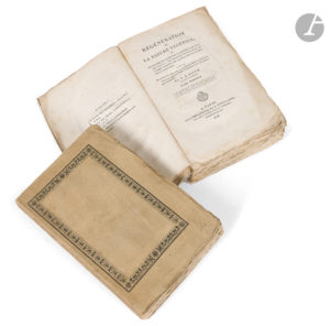 vues sur le ministère que la puissance végétale semble avoir à remplir dans l’harmonie des éléments. Paris : imprimerie de P. Didot l’aîné, 1818. — 2 volumes in-8, 213 x 166 : xxxi pp., (2 ff.), 502 pp., couverture illustrée ; 398 pp., couverture illustrée. Broché, non rogné. Seconde édition entièrement revue et augmentée grâce à des observations nouvelles, de l’Harmonie hydro-végétale et météorologique que l’auteur publia pour la première fois en 1802. François Antoine Rauch (1762-1837), ingénieur des Ponts-et-Chaussées, est considéré comme le père fondateur de la pensée écologique en France. Dès 1802, il dénonçait déjà les effets néfastes du déboisement en Asie, en Afrique et en Europe ; dans cette édition de 1818, il inclut également l’Amérique. Il met en garde contre les défrichements imprudents en France, qui provoquent des éboulements, des ravinements et la désertification. Il loue les forêts protectrices de la Suisse, ainsi que les campagnes arborées d’Allemagne et d’Angleterre, insistant sur la nécessité de restaurer les forêts de montagne :« Puisque le temps est si lent à reproduire ce que l’homme a détruit dans un instant (...) soyons dociles à la voix du malheur qui nous crie de replanter avec célérité nos antiques montagnes. » S’intéressant aux progrès de l’agriculture, il admire l’équilibre naturel dans lequel chaque être vivant joue un rôle essentiel : selon lui, les oiseaux et les fourmiliers sont plus efficaces et plus sains que les « drogues » contre les insectes, tandis que les loups et les oiseaux de proie débarrassent la terre des charognes. Il est convaincu que le respect de la nature peut générer des bénéfices économiques, mais déplore qu’aucune des nombreuses écoles existantes ne soit consacrée à « tout ce qui concerne la végétation ». Enfin, il implore la bienveillance du monarque pour « relever et rajeunir cette antique France, mutilée dans son climat, ses attraits et ses productions. » (II, page 364). Exemplaire broché, tel que paru, à toutes marges et en grand partie non coupé. Les plats de couverture comportent un joli encadrement typographique. Rousseurs éparses. Quelques mouillures claires sans gravité dans le second volume.