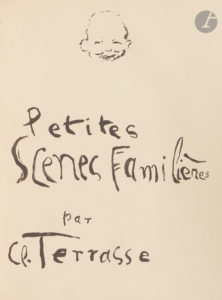 nerfs, tête dorée, non rogné, couverture conservée (Alix). Édition originale de ce recueil de partitions pour piano composé par Claude Terrasse (1867–1923). Cet ouvrage rassemble 15 pièces familières et 4 pièces humoristiques, illustrées par 20 lithographies originales en noir de Pierre Bonnard – dont une orne la couverture, tandis que les autres introduisent chaque partition. Particulièrement recherché, ce livre marque une étape majeure dans la carrière de Bonnard puisqu’il s’agit du tout premier ouvrage qu’il ait illustré. L’artiste, beau-frère de Claude Terrasse, y déploie un style à la fois poétique et intimiste, annonçant déjà le génie qui caractérisera son œuvre ultérieure. L’édition fut tirée à petit nombre, sans que l’on sache exactement le nombre d’exemplaires. Exemplaire parfaitement conservé, relié par Alix. Quelques rares rousseurs éparses sans gravité.