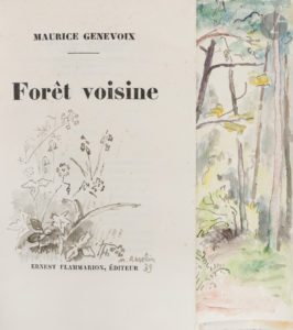GENEVOIX (Maurice). Forêt voisine. Paris : Ernest Flammarion, [1933]. — In-12, 192 x 175 : (1 f. blanc), 282 pp., (2 ff.), couverture imprimée. Broché, chemise à dois de toile verte et étui cartonné postérieurs. Thiébaud, 453. Seconde...