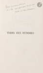 reportages pour rédiger son troisième livre, Terre des hommes, publié en février 1939. Bien que considéré comme un récit autobiographique et non un roman, il reçut le Grand Prix du roman de l’Académie française. L’œuvre retrace les aventures des pilotes de l’Aéropostale entre 1926 et 1935. L’auteur y évoque notamment ses débuts à la société Latécoère à Toulouse, ainsi que son rôle dans le transport du courrier entre Toulouse et Dakar. Il aborde des thèmes profonds tels que la mort, l’amitié et la quête de sens. Le titre initial, Étoile par grand vent, fut modifié en Terre des hommes grâce à une suggestion de son cousin André de Fonscolombe. Le livre sera également publié aux États-Unis en juin 1939, sous le titre Wind, Sand and Stars. Un des 130 exemplaires sur vélin pur fil des papeteries Lafuma Navarre, celui-ci portant le numéro 60, enrichi de cet envoi autographe signé de l’auteur sur le faux titre : Pour le docteur Siroux // En très sympathique hommage // Antoine de Saint Exupéry Bon exemplaire malgré le dos en partie décollé. Provenance : Docteur Siroux, avec envoi de l’auteur.