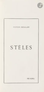 étiquette collée sur le premier volet, étui. Pierre Saunier, Victor Segalen, l’Exote, n° 87 à 91. Édition originale, dédiée à Paul Claudel, de cette œuvre majeure de Victor Segalen, conçue et financée par l’auteur lui-même. Imprimée à Péking sur les presses de Pei-T’ang, elle comprend notamment sept calligraphies chinoises imprimées à pleine page, ainsi que trois sceaux rouges apposés à la main : « le premier, justificateur du tirage, reproduit le titre du recueil - il est placé sous le numéro de chaque exemplaire. Le deuxième, placé sur la feuille suivante, en regard du premier, est le cachet familier de l’auteur : le “sceau de Mi Yuan” […] Le troisième se trouve à la fin des Stèles et doit se déchiffrer ainsi : “Wou-tch’ao Sin-siuan nien tsiuan”, et promulgue, à la fin de tout, ce que la première des Stèles, “Sans marque de Règne” annonçait. On peut traduire : “Composé durant la période Promulgation de l’Empire du Cœur de la dynastie Sans avènement dynastique” » (P. Saunier, Victor Segalen, l’Exote, p. 85). Un des exemplaires numérotés sur vélin parcheminé, ou papier européen (n° 212). Le tirage serait de 200 exemplaires sur ce papier. Ces derniers ont été publiés sous une couverture à volets. Les papiers extérieurs varient d’un exemplaire à l’autre, mais la doublure est toujours composée d’un papier marbré « maître-relieur » presque identique. Seuls les 81 premiers exemplaires sont contenus entre deux planches de camphrier ou deux cartons recouverts de tissu. Quelques usures à l’étui, petites déchirures sans manque aux pliures de la chemise. Quelques taches à la couverture.