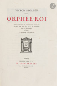 SEGALEN (Victor). Orphée-Roi. Paris : Georges Crès et Cie, Le théâtre d’art, 1921. — In-8, 235 x 171 : frontispice, (2 ff.), VI pp., (2 ff.), 131 pp., (2 ff.), couverture imprimée. Broché, non rogné, couverture rempliée. Édition...