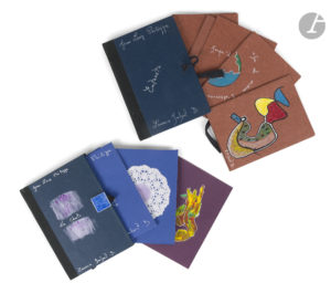 105 : (10 ff). En feuilles, sous chemise cartonnée à lacets. Il existe 14 exemplaires uniques de ce livre d’artiste. Celui-ci, numéroté 8, comprend 4 peintures et une composition de fils argentés. - La Chute. S.l. : Laurence Imbert D, 2014. — 151 x 105 : (10 ff.), 1 dessin. En feuilles, sous chemise cartonnée à lacets, illustrée sur le premier plat et comprenant un carreau de mosaïque bleu sur le bord de chacun des plats. Livre d’artiste réalisé en neuf exemplaires uniques, chacun conçu comme une pièce originale. Le texte, calligraphié à la main sur papier Canson bleu, est enrichi de collages variés, parfois rehaussés. L’ensemble est accompagné d’une peinture originale signée, exécutée sur Canson violet. Cet exemplaire, numéroté 3, est signé par l’auteur et l’artiste à la justification.