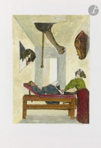PHILIPPE (Jean-Loup) - CHARMOY (Cozette de). L’Hospice des mots. Paris : Ottezec, [2004]. — In-4, 297 x 210 : (3 ff.), 12 ff., (3 ff. premier et dernier blancs), 12 planches, couverture illustrée. En feuilles, sous couverture rempliée. Édition...