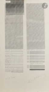 1er et le 10 août 2005. Réalisé sur un feuillet de papier japon d’environ un mètre de long, il est signé de la main de l’artiste, figure majeure de la poésie expérimentale. Ces œuvres sont des poèmes visuels, où l’auteur superpose lettres, chiffres et signes pour former des textures visuelles denses et des compositions abstraites. Le terme « dactylo-poème » a été inventé par Chopin dans les années 1960 pour désigner cette nouvelle forme de poésie, à la frontière entre l’écriture et le dessin.