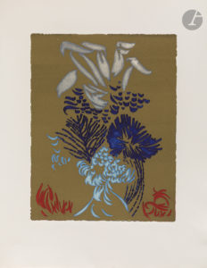 Édition en partie originale, contenant sept poèmes nouveaux, illustrée de 10 gravures originales en couleurs à pleine page du peintre, graveur et sculpteur Jacques HÉROLD (1910-1987). La Note sur Georges Bataille de Patrick Waldberg, a été spécialement écrite pour cette édition. Tirage à 170 exemplaires sur vélin d’Arches, signés par l’artiste. Celui-ci, numéroté 141, fut spécialement imprimé pour Edith Philippe, la mère de Jean-Loup Philippe. Salissures et taches sur l’emboîtage. On joint : - DERAIN (André) - BEAUMARCHAIS (Pierre-Augustin Caron de). Le Barbier de Séville. Paris : Nouveau cercle parisien du livre, [1963]. — In-folio, 360 x 282 : (2 ff blancs), 148 pp., (8 ff. 2 derniers blancs), couverture illustrée. En feuilles, couverture rempliée, chemise et étui de l’éditeur. Intéressante édition reprenant 56 gouaches de personnages et de décors qu’André DERAIN avait réalisées en 1953 pour la représentation de l’opéra de Rossini au festival d’Aix-en-Provence. Elles ont été portées sur pierres par Maurice Mourlot et tirées dans le texte, à pleine page ou sur double page par Mourlot frères. Tirage limité à 270 exemplaires sur vélin de Rives à la forme. Celui-ci fait partie des 150 pour le “Nouveau Cercle Parisien du Livre” ; numéroté CXLI, il a été spécialement imprimé pour Edith Philippe, la mère de Jean-Loup Philippe. Quelques salissures à la chemise et l’étui.