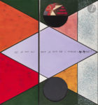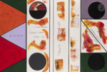 tirée à 13 exemplaires uniques sur vélin d’Arches, entièrement écrit à la main, sauf le titre, et décorée de peintures et de compositions originales par Laurence IMBERT D (née en 1945). L’ouvrage se compose d’un feuillet de titre, de deux grands triptyques, d’un petit triptyque collé au centre d’une peinture de la hauteur du livre entre deux grandes bandes de bois argentées, et d’un feuillet de justification. Le coffret est de Dermon Duval. Tous les exemplaires sont signés par l’auteur et l’artiste à la justification, celui-ci porte le numéro V. Exemplaire très bien conservé.
