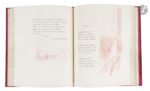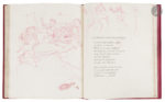 doublures et gardes de daim rose foncé, tranches dorées sur témoins, couverture et dos conservés, chemise à dos et bandes à rabats de maroquin cerise, étui bordé (Creuzevault). Montel, Bibliographie de Paul Verlaine, 1924, p. 12. – Galantaris, Verlaine, Rimbaud, Mallarmé, pp. 133-135. Un des chefs-d’œuvre du livre illustré, considéré comme le premier livre de peintre moderne. Il s’agit de la première édition illustrée de Parallèlement, incluant également Les Sonnets des Amies, achevée d’imprimer le 29 septembre 1900 et annoncée dans la Bibliographie de la France du 19 janvier 1901. Cet ouvrage marque un tournant dans l’histoire de l’édition d’art et inaugure la riche carrière d’éditeur d’Ambroise Vollard. Illustré de 109 lithographies originales de Pierre Bonnard (1867–1947), tirées en rose, et de 8 dessins gravés sur bois par Tony Beltrand, tirés en noir, ce livre est le fruit d’une collaboration exceptionnelle entre poésie et arts visuels. Comme le souligne Antoine Terrasse, « Il n’est pas étonnant qu’Ambroise Vollard ait songé à Bonnard pour illustrer Parallèlement de Verlaine. Il connaissait les dessins de l’artiste pour Marie ; et il avait vu le tableau L’indolente, dont un dessin figurera d’ailleurs dans l’ouvrage, à l’exposition de groupe organisée chez Durand-Ruel en mai 1899. Pour accompagner les poèmes de Verlaine, Bonnard invente une composition irrégulière, les lithographies jouent avec les strophes, les enlacent, se mêlent à elles ou se glissent dans les marges, images voluptueuses et tendres dont le pouvoir de suggestion s’allie miraculeusement à l’art du poète » (Antoine Terrasse, Pierre Bonnard, 1967, p. 61). L’impression, réalisée sur les presses à bras de l’Imprimerie nationale, utilise une fonte de caractères gravés en 1540 par Garamond sur l’ordre de François Ier. Les lithographies, imprimées à la main par Auguste Clot, emploient une encre rose-sanguine spécialement choisie par Bonnard pour restituer « l’atmosphère poétique » de Verlaine. Tirage limité à 200 exemplaires, plus 21 exemplaires sur vélin de Hollande (lettrés de a à u), non mentionnés dans la justification, et quelques exemplaires de chapelle. Celui-ci est l’un des 170 exemplaires sur vélin de Hollande, numérotés de 31 à 200, et porte le numéro 89. Exemplaire de première émission, avec la marque de l’Imprimerie nationale sur le titre et la couverture, ainsi que le feuillet protocolaire « Imprimé par décision spéciale de Monsieur le Garde des Sceaux, Ministre de la Justice ». L’Imprimerie nationale, ayant réalisé a posteriori le caractère sensuel du texte de Verlaine et des illustrations de Bonnard, ordonna de remplacer rapidement ces mentions par des illustrations de l’artiste. Les exemplaires de première émission, comme celui-ci, sont donc d’une extrême rareté. Superbe exemplaire dans une sobre mais parfaite reliure janséniste de Creuzevault, très bien conservé, sans rousseurs ni transferts des lithographies.