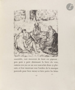 : X, 294 pp., (2 ff. dernier blanc), couverture illustrée. Broché, non rogné, chemise et étui. Célèbre édition illustrée, ornée de 156 lithographies originales de Pierre BONNARD (1867-1947). Il s’agit du second livre publié par Ambroise Vollard, après le révolutionnaire Parallèlement de Paul Verlaine paru en 1900 avec des illustrations du même artiste. « Parallèlement ainsi que Daphnis et Chloé, feront vivre le nom de l’éditeur Vollard. Là, tout concourt au plaisir des yeux et de l’intelligence : choix du format, du papier, qualité du tirage et de l’impression, harmonie réalisée entre le caractère typographique et l’image. Ces ouvrages, tirés à deux cent cinquante exemplaires, n’eurent point l’heur de plaire aux bibliophiles qui mirent plus de vingt années à les comprendre » (Roger-Marx, Les illustrations de Bonnard, Plaisir de bibliophilie, II, 1926, pp. 1-10). L’édition fut tirée à 250 exemplaires. Celui-ci est l’un des 200 sur Hollande à la forme (n° 226), enrichi, sous la justification, d’un envoi autographe signé d’Ambroise Vollard adressé à l’épouse de l’homme politique Étienne Clémentel : Hommage de l’éditeur // à Madame Etienne Clementel // Vollard L’ouvrage parut normalement en feuilles, celui-ci a été très habilement broché postérieurement avec la couverture d’origine. Il est parfaitement conservé. Provenance : Madame Étienne Clémentel, avec envoi de l’éditeur.