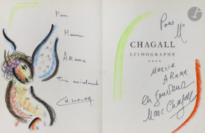 imprimée de l’éditeur, sous jaquette illustrée. Quatrième volume seul sur les 6 parus du catalogue raisonné des lithographies de Marc CHAGALL (1887-1985), celui-ci portant sur la période de 1969 à 1973. Il est illustré de deux lithographies originales en couleurs de l’artiste, tirées par Mourlot, dont une sur la jaquette et une en frontispice. Précieux exemplaire du peintre, graveur, sculpteur et historien de l’art Maurice ARAMA (né en 1934), portant un double envoi de Sorlier : Pour Maurice Arama. Très cordialement Ch. Sorlier et de Chagall : Pour Mr Maurice Arama en souvenir. Marc Chagall Ce dernier a enrichi son envoi d’un superbe dessin original en couleurs représentant une sorte de cheval ailé. Autour de sa dédicace, il a réalisé deux traits courbes, vert et orange. M. Arama nous a précisé dans quelles circonstances ces envois ont été faits : « Je faisais des lithos chez Mourlot et je travaillais au milieu d’autres artistes. Fernand Mourlot nous a demandé de ne pas venir le lendemain matin, car il devait accueillir Marc Chagall en fin de matinée. Passant devant moi il me dit : “toi tu peux venir, mais tu restes dans ton coin.” Quand Chagall passa devant moi, il me présenta à lui comme un “peintre juif et marocain”. Nous avons échangé quelques banalités et à la fin de la visite, Sorlier revint vers moi avec un de ses livres sur Chagall qu’il lui avait fait dédicacer pour moi, et sur une autre page, Sorlier me témoigna son amitié. C’est un souvenir important dans mon parcours. » Déchirures à la jaquette. Provenance : Maurice Arama, avec envois autographes.