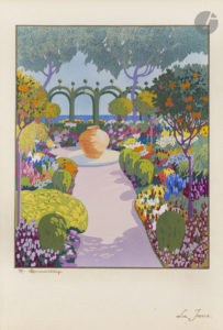 illustrée à rabats. Édition originale de cet exceptionnel album, préfacé par Henri de Régnier, comprenant huit magnifiques compositions en hors-texte, en couleurs, réalisées par l’artiste et illustrateur Raymond Louis Charmaison (1876-1955). Ces œuvres évoquent de somptueux jardins et ont été colorées au pochoir par Jean Saudé. L’ouvrage comporte également une composition en couleurs sur la couverture ainsi que 4 ornements en noir du même artiste. Les compositions hors texte sont signées dans la planche. Tirage limité à 300 exemplaires sur papier du Japon. Celui-ci, numéroté 300, fait partie des 280 sans pièces ajoutées. Il a été enrichi, à part, sur un feuillet in-folio, d’un beau dessin original dans les tons bruns de Charmaison, portant cette dédicace : A Yves Kroeger, cette petite remarque, en toute amitié, // pour joindre à ce Trois centième enfant retrouvé. // ce qui Hélas, ne me rajeunit pas ! // Fleury en Bierre 11 Novembre 1945 // R. Charmaison Exemplaire très bien conservé. Sans les liens. Petites déchirures au dos de l’étui. Provenance : Yves Kroeger, avec envoi de l’artiste.
