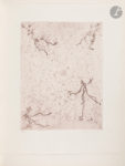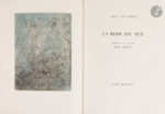 géométriques irrégulières figurant au centre une rose stylisée, laissant voir un fond de box rose au centre et gris tout autour, traversés de bandes de cuir noir, dos lisse avec deux compartiments ovales évidés faisant apparaître un fond de box gris décoré chacun de deux bandes de cuir noir orné et orné des noms de l’illustrateur et de la poétesse en lettres dorées, titre de l’ouvrage en lettres rose au centre, doublures et gardes de papier bois rose, tranches dorées sur témoins, couverture et dos conservés, chemise à dos et bandes à recouvrement de box noir, étui bordé (Leroux 1962). Édition originale tirée à 300 exemplaires, de ce recueil poétique de la poétesse Lena Leclercq (1926-1987). Un des 90 premiers exemplaires, comprenant 6 eaux-fortes originales en couleurs hors texte de Max Ernst (1891–1976), justifiées et signées par l’éditeur, ainsi que signées par l’auteur et l’artiste à la justification. Exemplaire précieux, relié à l’époque par Georges Leroux, et enrichi d’une épreuve d’essai de l’avant-dernière eau-forte du livre, justifiée et signée par Max Ernst, montée sur onglet en tête. Dans un catalogue de 1954, le libraire Jean Hugues met en lumière une reliure modeste de Georges Leroux, alors quasi inconnu, pour un manuscrit précieux : la traduction de La Chasse au Snark par Aragon, offerte à Man Ray. Leroux, passionné de littérature et de surréalisme, trouve en Jean Hugues un soutien décisif : ce dernier l’introduit dans son cercle d’amateurs et l’aide à surmonter ses difficultés matérielles. Malgré leurs différences (le libraire expansif et le relieur timide, introverti), une amitié indéfectible et une passion commune pour la poésie les unissent. Leroux, plus « bookman » qu’artisan traditionnel, cherche à réconcilier reliure et arts plastiques contemporains, une vision partagée par Jean Hugues. Grâce à lui, Leroux accède à une clientèle d’exception et intègre même le cercle intimiste des « samedistes » de la rue de Furstenberg. Plus tard, Max Ernst lui confiera des reliures pour sa bibliothèque, sur les conseils de Jean Hugues. Ce dernier, fasciné par le génie déroutant et imprévisible de Leroux, en fait un pilier de sa librairie, tout en préférant parfois des reliures plus sobres pour ses propres livres. (cf. Jean Hugues. Libraire-éditeur. Paris : Éditions des Cendres, 2004). Leroux réalisa au moins une autre reliure identique à celle-ci, mais dans des teintes différentes, qui figura successivement dans la vente de la bibliothèque de Renaud Gillet (1913-2001) en 1999 (vente Sotheby’s Londres, 27 octobre 1999, lot n° 101) et dans celle de Pierre Brossette en 2005 (vente Sotheby’s Paris, 22 mai 2005, lot n° 113). Exemplaire très bien conservé. Marque brune sur les premières gardes, sans gravité. Provenance : N. Harwich, avec ex-libris.