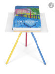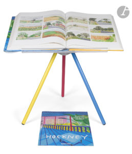 peintre, A Bigger Book est une rétrospective visuelle grandiose des œuvres de David Hockney. L’artiste y revient sur plus de soixante années de travail, de son adolescence en école d’art à sa récente série de portraits, ses dessins sur iPad, et les paysages du Yorkshire. Jamais l’œuvre de Hockney n’avait fait l’objet d’une publication aussi exhaustive, enrichie d’un tel investissement de l’artiste et à une échelle si saisissante et propice à l’immersion » (présentation de l’éditeur). Ce monumental ouvrage fut publié par Hans Wener Holzwarth et se présente avec un lutrin original signé de l’artiste designer australien Marx Newson. Il contient des centaines de belles reproductions en couleurs sur près de 500 pages, dont 13 sont dépliantes. Tirage à 10 000 exemplaires, celui-ci fait partie des 9000 numérotés de 1001 à 10000. Sans le volume de 680 pages contenant la chronologie illustrée de l’œuvre de l’artiste, mais complet de la brochure de présentation au format du livre. Exemplaire parfaitement conservé.