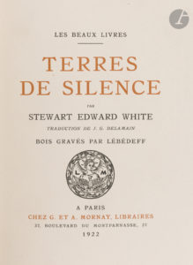 LÉBÉDEFF (Jean) - WHITE (Stewart Edward). Terres de silence. Paris : G. et A. Mornay, 1922. — In-8, 230 x 177 : frontispice, 251 pp., (5 ff. 3 derniers blancs, couverture illustrée. Broché, couverture rempliée, chemise à recouvrement à dos...