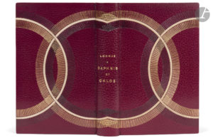 MAILLOL (Aristide) - LONGUS. Daphnis et Chloé. [Paris : Les frères Gonin], 1937. — In-8, 215 x 134 : (4 ff. 3 premiers blancs), 217 pp., (4 ff. 2 derniers blancs), couverture illustrée. Maroquin bordeaux, grand motif circulaire en maroquin blanc...