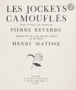 MATISSE (Henri) - REVERDY (Pierre). Les Jockeys camouflés. Paris : La Belle Édition, [1918]. — In-4, 250 x 220 : (25 ff.), couverture imprimée. Broché. Première édition tirée à 343 exemplaires, de ce recueil de 3 poèmes de Pierre Reverdy,...