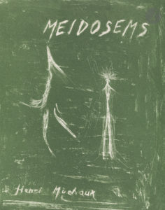 MICHAUX (Henri). Meidosems. Paris : Éditions du point du jour, 1948. — In-8, 248 x 191 : (1 f. blanc), 95 pp., (3 ff. deux derniers blancs), 1 planche, couverture illustrée. En feuilles, couverture rempliée, chemise cartonnée à lacets de...