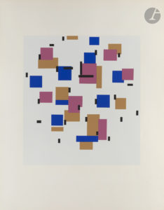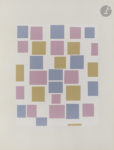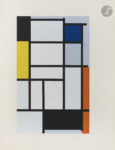 MONDRIAN (Piet). [Album de 12 sérigraphies en couleurs]. Paris : Galerie Denise René, 1957. — Album in-plano, 650 x 500 : (2 ff.), 12 planches. En feuilles, sous chemise à rabats de l’éditeur. Album devenu rare complet, tiré à 300...