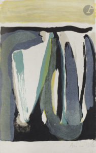 VAN VELDE (Bram) - JULIET (Charles). Au long de la spirale. Paris : Maeght éditeur, [[1975]. — In-folio, 450 x 285 : (20 ff. 2 premiers et 2 derniers blancs), couverture muette. En feuilles, couverture rempliée, emboîtage en toile bleue de...