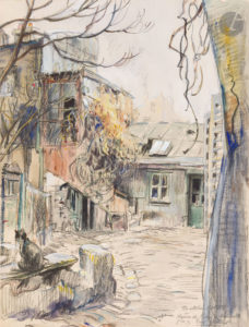 coins, dos à nerfs, tête dorée, non rogné, couverture et dos conservés, étui bordé (Semet et Plumelle). Édition originale recherchée de cette série de 6 promenades dans le Montmartre du début du XXe siècle, écrites par Francis Carco et illustrées de main de maître par le graveur, illustrateur et aquarelliste Eugène VÉDER (1876-1936). L’illustration comprend 6 eaux-fortes originales hors texte sous serpente légendée et 25 dessins en noir reproduits dans le texte et à pleine page. Les eaux-fortes représentent : La place du Tertre. La ferme Debray et les Moulins. Le cabaret du Lapin agile. La maison de Mimi Pinson, rue du Mont-Cenis. L’entrée du passage Cottin et rue du Chevalier de la Barre, prises de la rue Lamarck. Et le panorama de Paris, pris du Sacré-Cœur. Tirage limité à 291 exemplaires. Celui-ci est l’un des 20 sur japon impérial, second papier après un unique exemplaire sur vélin teinté Van Gelder, signés par l’auteur et l’artiste à la justification, comprenant une aquarelle originale inédite signée de Véder, un tirage en couleurs et en noir des eaux-fortes, la décomposition des couleurs de chacune d’elles et un tirage à part des 25 dessins en noir. L’aquarelle, datée de décembre 1921, offre une version alternative de l’illustration de la page 26, représentant un atelier d’artiste situé dans la cour de la maison dite de Mimi Pinson. Son intérêt historique et artistique est remarquable : cette maison était l’une des adresses emblématiques de Montmartre, située rue du Mont Cenis, souvent immortalisée par les peintres et reproduite sur de nombreuses cartes postales d’époque. Cependant, ces représentations se concentraient généralement sur la façade côté rue, tandis que cette aquarelle en propose une vue intimiste côté cour, offrant ainsi un témoignage rare et précieux de ce lieu mythique. La maison fut détruite en 1925. Très bel exemplaire relié par Semet et Plumelle, enrichi du prospectus de parution monté sur onglet à la fin. Dos légèrement assombri. Provenance : Jules Exbrayat, avec ex-libris (III, 1962, lot 40). - N. Harwich, avec ex-libris.