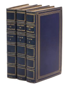 Cologne, Pierre Marteau, 1700-1701. 3 volumes in-12, maroquin bleu nuit à long grain, six filets dorés sur les plats avec petits fleurons d'angles, dos orné, dentelle intérieure, tranches dorées (Reliure vers 1900).Édition originale, de premier et de second tirage.