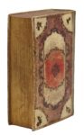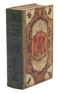 Altenburg, Herzogl. Sächs. Hofbuchdruckerey, 1795. 3 parties en unvolume in-8, vélin polychrome sur ais de bois, plats garnis d’un décor de compartiments délimités de guirlandes, fleurs avec feuilles et tige mosaïquées rouge et vert sur fond ivoire aux 4 coins, fleuron doré dans un médaillon rouge au centre, dos de vélin vert céladon orné, tranches dorées et ciselées, doublure de papier peint polychrome, provenance datée gravée au noir sur le premier plat: GK / GFE / 1797 (Reliure de l'époque).Remarquable spécimen de reliure populaire allemande connue sous le nom de Bauerneinband (reliure de paysan), réalisée à partir de techniques mixtes associant teinture, dorure, estampage, mosaïque et incrustation, colles et vernis. Ces reliures, inspirées par le folklore et l’esthétique populaire, ont été réalisées de la fin du XVIIe au début du XIXe siècle à destination d'une clientèle aisée. Elles recouvrent essentiellement des livres religieux ou de dévotion en milieu réformé, en Allemagne, aux Pays-Bas, en Scandinavie et dans les Balkans.
