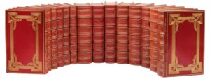 Paris, Charpentier, 1871-1893. 21 volumes in-12, maroquin rouge, encadrement de filets et écoinçons feuillagés et dorés, doublures de maroquin bleu, tranches dorées, couverture, étuis (Lortic fils).Exceptionnelle collection complète des vingt romans du cycle des Rougon-Macquart en édition originale.