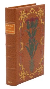 Paris, G. Charpentier, 1877. In-12, maroquin brun, plats biseautés entièrement ornés d'un grand bouquet vert et bordeaux de chardons encadré d'un ruban havane et beige entrelacé, pièce de titre de maroquin orange, doublures de maroquin ocre à double encadrement mosaïqué vert encadré d'un listel de maroquin chaudron, tête dorée, étui bordé (Jadis).Édition originale.