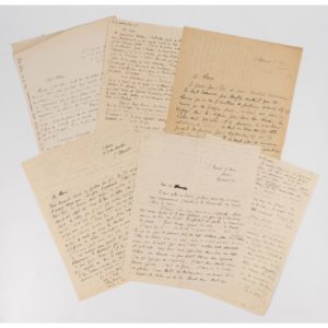 confession et nouvelles de son entourage : "l'importance au mot m'est révélée par la Kabbale que j'étudie ésotériquement en ce moment". - 11.02.1938, St Benoit, 4 pp. in-8 : 2 longs portraits : d'Henri de Groux ("Il avait l'air d'un sacristain d'opérette", et que Degas qui refusa de revoir) ; et de Satie, "figure de satyre joyeux", "il mettait la main devant la bouche pour rire mystérieusement, portait des faux cols droits, mangeait rarement et rentrait à Arcueilp à pied la nuit". - 11.02.1938, St Benoit, 2 pp. in-8 : au sujet de la triste mort du fils du galeriste Théo Briant, puis critique de Claudel : "dans sa lettre à propos des Morceaux choisis il me dit : "Votre poésie nue est sans art". Il confond art et artifice. Dieu me préserve de l'art". - 12.01.1940, St Benoit, 2 pp. in-8 : au sujet de l'astrologue Conrad Moricand, "le seul homme qui souffre autant que toi. (...) Il m'écrit pour m'annoncer la fin de cette guerre-ci entre juin et août 40 (...) Si Staline est l'Antéchrist, la fin du monde n'est pas loin. - 6.11.1942, 2 pp. in-8 : au sujet du poète Jean Royère, de La Phalange Pierre Emmanuel, Roger Lannes, Adolphe Boschot (musicologue d'Orléans). "Je t'envie aussi ne n'être pas encore blasé de la littérature, des littérateurs".