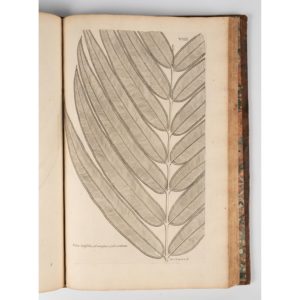 numérotées ; veau brun, tranches mouchetées (Rel. de l'époque). Pritzel, 7213 ; Nissen, 1544 ; Bibliothèque conservatoire botanique, Genève, 284. Rare édition originale du premier ouvrage illustré consacré exclusivement aux plantes américaines. Le père Charles Plumier (1646-1704) fit trois voyages en Amérique, envoyé par Louis XIV pour collecter, dessiner, décrire la faune et les plantes exotiques des Antilles et d'Amérique tropicale. Source de référence pour les botanistes du XVIII? siècle (Tournefort, Linné), cet ouvrage, qui fut sa première publication, consacra Plumier comme botaniste royal. Elle est illustrée de 108 belles planches en noir. Une place majeure est donnée aux fougères ; suivent les arbres et arbustes tropicaux (ex. gommier, mahogany, pois d'Angole, coton sauvage), les plantes alimentaires et médicinales (manioc, ananas, piment, etc.), et les plantes ornementales (hibiscus, bignoniacées, passiflores). Provenance : bibliothèque du paysagiste martiniquais Jean-Philippe Thoze (1941-2017), qui créa en 1982 sur les hauteurs de Fort de France, le fameux "Jardin de Balata", l'un des sites les plus fréquentés de la Martinique. Deuxième tirage, avec le titre à la bonne date 1693 (au lieu de 1713). Titre taché, avec petite zone grattée sous la date et petite déchirure restaurée dans la marge. Petite galerie de vers marginale traversant le volume, infimes taches noires aux planches 41, 42, 67, 88, 101, 102 ; petites mouillures marginales pl. 57 et 58, 83 à 95 ; rares petites rousseurs. Reliure frottée, tachée, dos manquant ; restaurations aux coiffes, mors et coins.