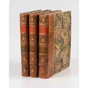 de l'alphabet Tartare mantchou, etc. Paris, Imprimerie de Pierre Didot l'aîné, 1795-1798. 3 vol. in-4, I : LV pp., 176 pp. ; II: 256 pp. ; III : pp. 1-149, (2) ff., pp. (150)-392 ; demi-basane fauve marbrée, dos à nerfs orné, pièce de titre rouge et de tomaison verte (Reliure moderne). Seconde édition en français, ornée d'un portrait de l'auteur, deux frontispices gravés, 159 planches numérotées et la plupart dépliantes, et 9 planches non numérotées. Tome I, mouillure pâle ; tome II, petite mouillure angulaire. Tome II, p. 9, petite déchirure restaurée. Rousseurs au portrait, aux frontispices, et à certaines pl. (dont pl. 60, 113, 114, 158, 168).