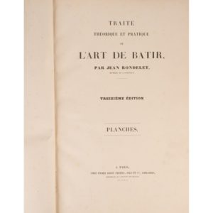 RONDELET (Jean). Traité théorique et pratique de l'art de bâtir. Treizième édition. Paris, Firmin-Didot, s.d. (1877). In-plano, bradel cartonnage papier marbré, pièce de titre rouge (Cartonnage de l'époque). Atlas de 207...
