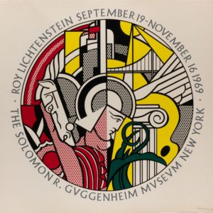 Roy LICHTENSTEIN (1923 - 1997) Affiche pour le Solomon R. Guggenheim Museum, New York 1969 Sérigraphie en couleurs de forme circulaire. Jaunie au verso, quelques pliures Circular colour screen print. Yellowing on the reverse, a few creases....