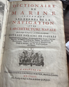 Dictionnaire de Marine contenant les termes de la Navigation. Amsterdam, 1722, fort in-4, plein veau, dos à nerfs ornés, pièce de titre, gravure frontispice.