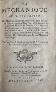 M. OZANAM. La méchanique ou il est traité des machines simples et composées. Paris, 1720 chez Claude Jombert.1 vol. in-8 plein veau, pièce de titre. (Usures)