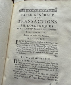 Transactions philosophiques de la société royale de Londres, années 1733-1734 et 1735-1736, deux volumes, in-4, plein veau dos à nerfs ornés, pièces de titres, dix gravures, frontispices.