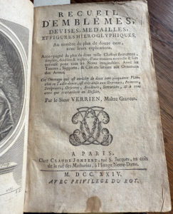 Sieur VERRIEN. Recueil d'emblèmes devises, médailles... Paris, 1724, in-8, plein veau, dos lisse orné. (Accidents dans le texte)
