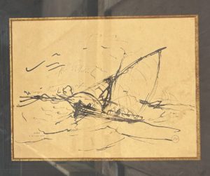 Joseph ALLEMAND (1835-1907) Bateau de pêche sur mer formée Lavis d'encre et encre sur papier bistre, signé du cachet d'atelier et du monogrammé, légendé des couleurs dans le ciel. 23 x 30 cm à vue