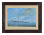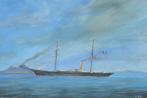 Gaetano D'Esposito (1858-1911) Le yacht Eros 2 de A. Rotchild devant le Vésuve en fumées, 1894 Gouache sur papier, nommée et datée en bas à gauche. Monogramme G.d'E en bas à droite. 30 x 44 cm