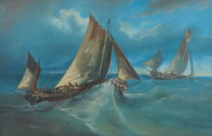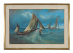 Ecole FRANÇAISE Deux cotres marchands à gréement aurique sur mer forte Gouache sur papier signée en bas à gauche, non déchiffré 48 x 72 cm